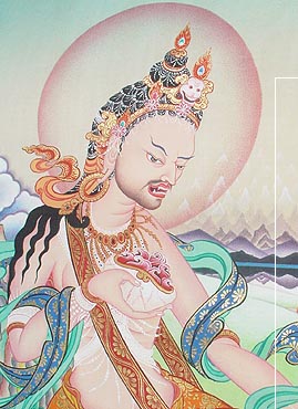 He found a “rascal” on the bank of a river who had “opened the stomach of a live man and was washing it with warm water.” Naropa asked him if he had seen Tilopa. The man said, “Yes, but before I show him, help me.” Naropa refuses, and once again everything is absorbed in rainbow light and the Guru’s voice sounds.